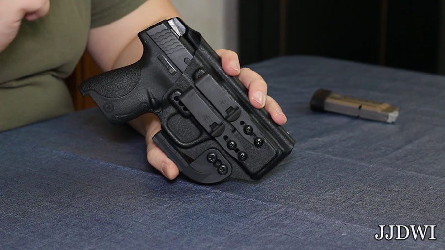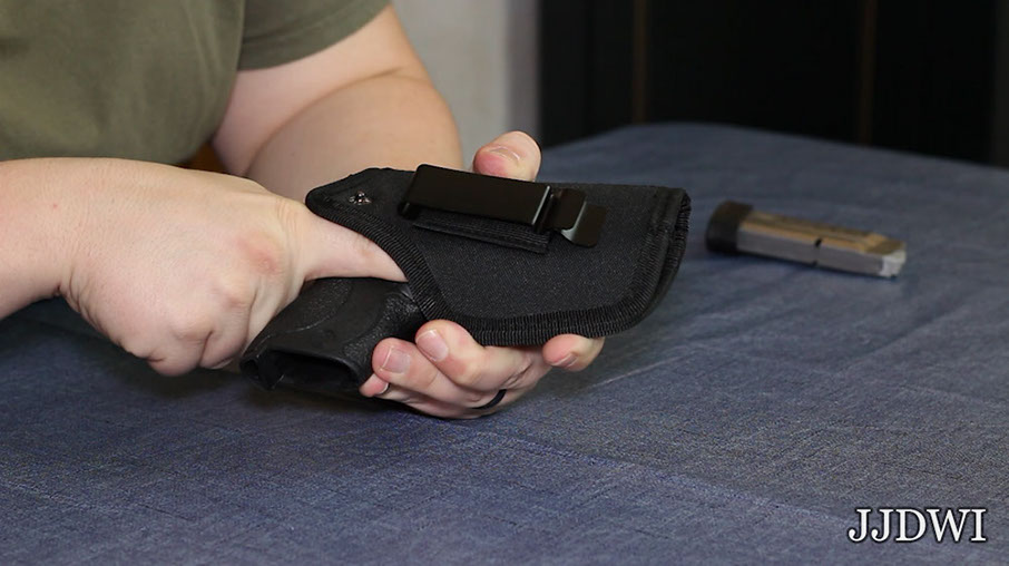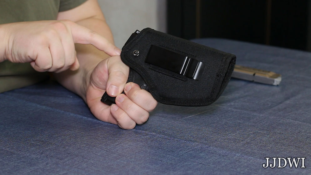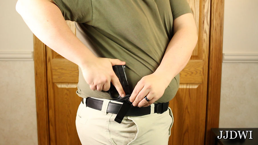 Now I’ll put this holster on in the 3 o’clock IWB position. I’ll have my shirt tucked in and no cover garment so you can see everything clearly, and we’ll check that last question.
